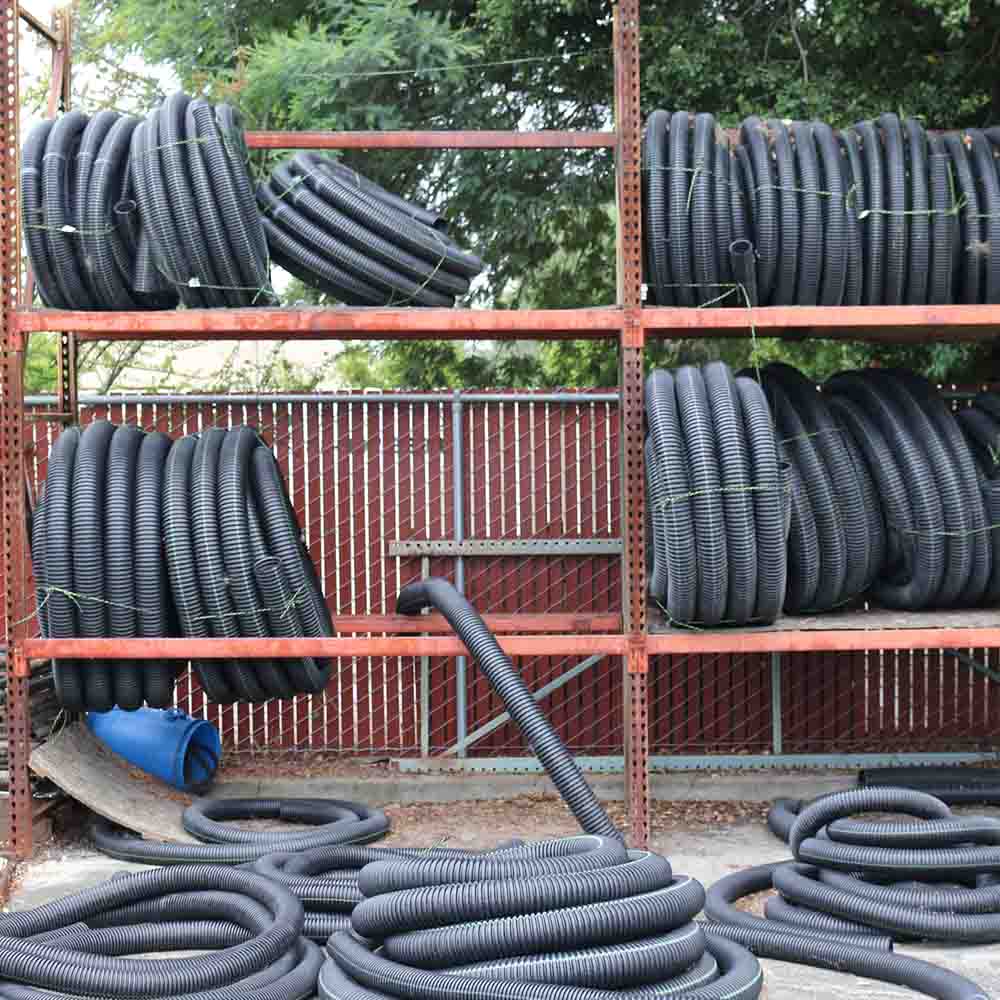 We have 3″ and 4″ diameter flexible black drain pipe in either perforated or solid wall.