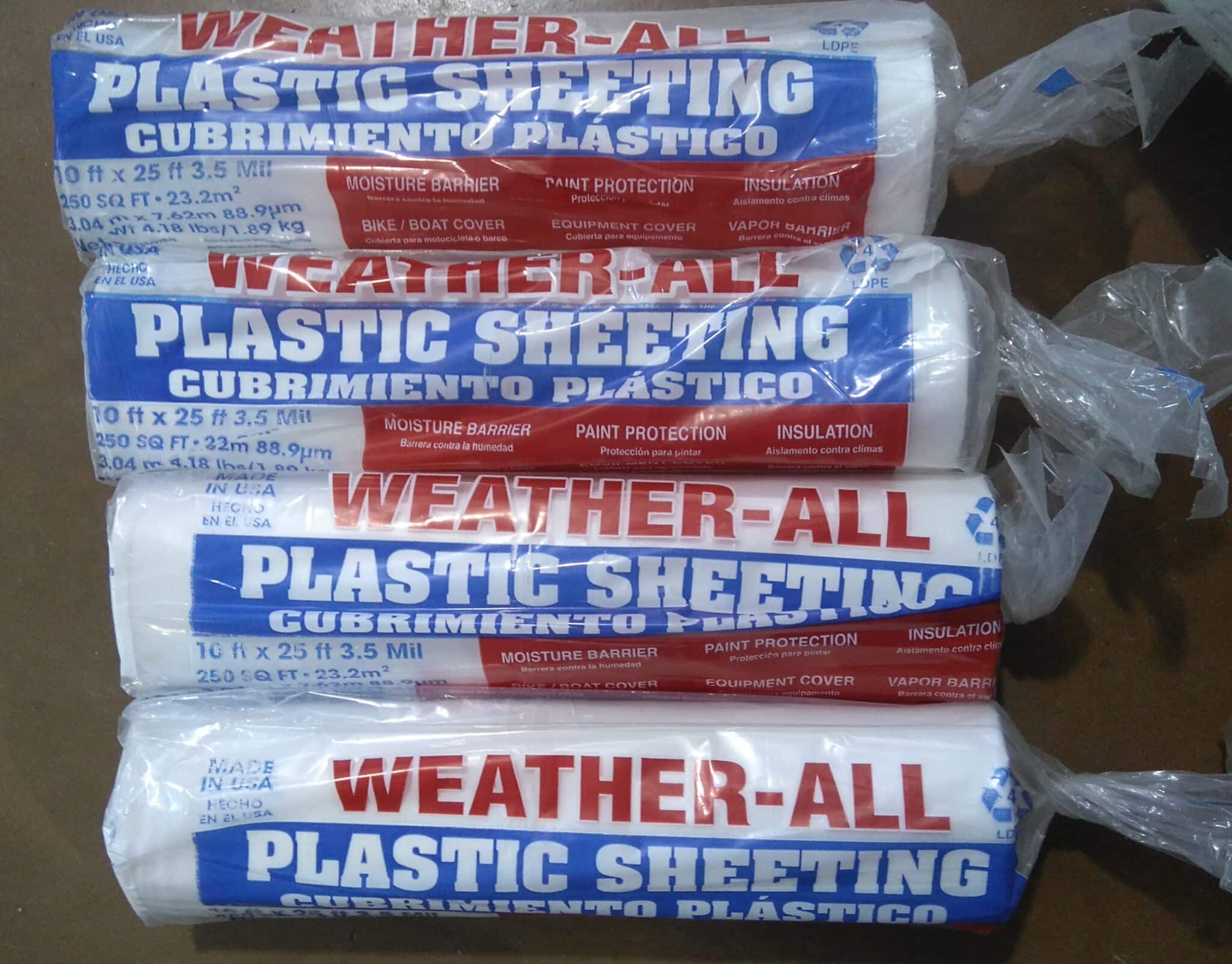 Plastic sheeting for moisture barriers, paint protection or insulation in rolls, 2, 3.5, 4, 6, and 10 mil thickness. Clear and black.